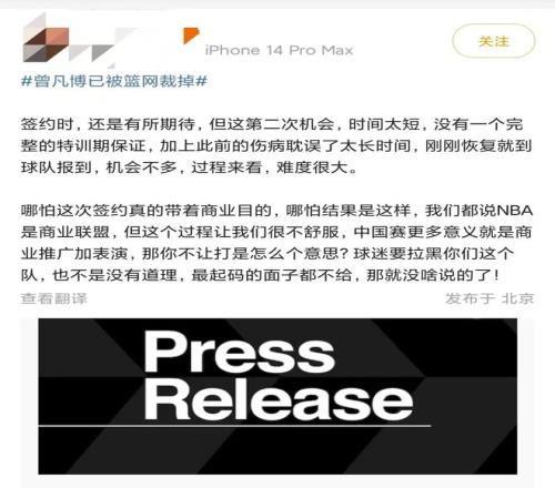 “中国球员曾凡博正式被球队裁掉。”