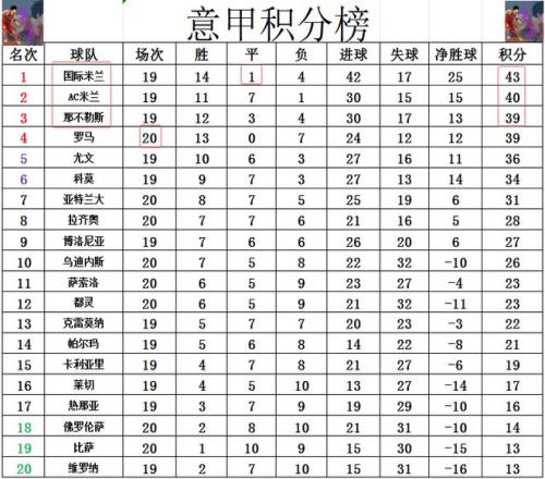 积分榜方面,随着那不勒斯绝平国米,上轮前3的争冠三强本轮都没能赢球,国米就还是3分优势力压AC米兰领跑。那不勒斯最后时刻拿到1分后,少赛一场,以净胜球优势超过罗马重回前3。