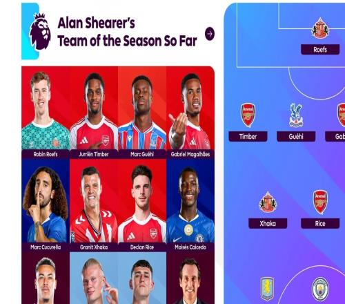 英超官方发布了阿兰-希勒评选的英超本赛季至今最佳阵容,哈兰德领衔,赖斯、凯塞多、扎卡等人在列。